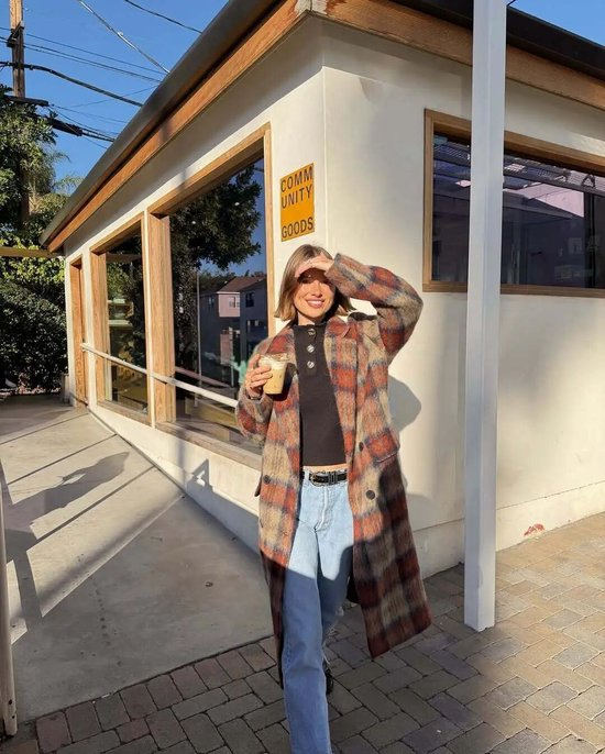 除了经典的大衣板型,今年不少博主穿的是这种斗篷式的格纹外套,衣摆自然垂坠的弧度会更加有复古氛围,搭配窄腿裤或是喇叭裤,慵懒又不失干练。