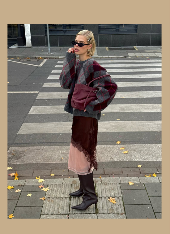 其中法则之一,就是“留白”。用纯色单品与简洁剪裁作基底,让格纹图案不必抢占全部视觉焦点,从而打造出平衡和谐的造型。比如穿格纹长裙时,配一双纯色长靴,便能为整体造型留出呼吸的余地。