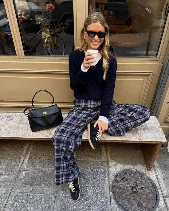 谁说格纹长裤只能是学生气十足的休闲穿搭?阔腿板型的格纹长裤可以说百搭又不无趣,尤其是冬天面对满衣柜的深色外套,格纹裤能够快速为造型增添点色彩。