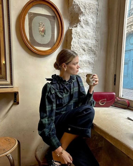 除此之外,格纹与不同材质的“混搭”也值得一试。比如格纹毛衣配缎面半裙,格纹的硬朗线条与真丝的柔滑质感相互碰撞,产生了奇妙的化学反应。