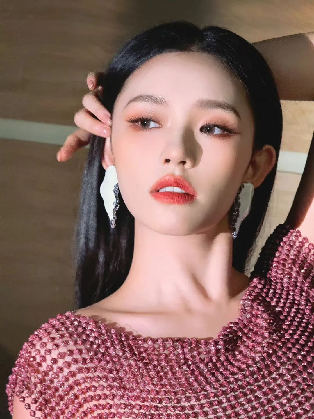 在妆容中运用红色更应该奉行“少即是多”的准则,不仅面积上需要做到正确取舍,冷暖、明暗都要相互适配。以徐娇的这款干净的国风美人红妆为例,她的暗红色绳结耳饰属于暗红色调,所以唇色自然就选择了同款。而眼妆和腮红仅仅强调轮廓就够,眉毛也是淡淡的野生感,让妆容整体浓淡和谐。