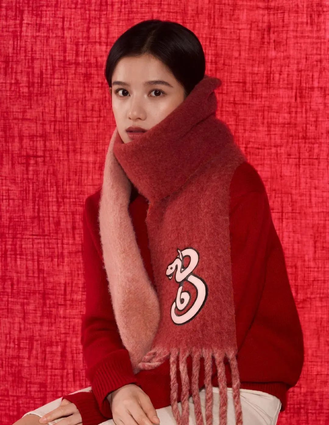 如果今年你准备在穿搭上大红特红一把,那么就把妆容的红色降一降,像张婧仪这身红毛衣+红围巾的叠穿就不太适合再在妆容多发力,仅用深红色唇彩做呼应就完成了点题。