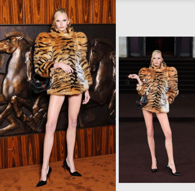 Alex Consani演绎的虎纹皮草更为惊艳。
